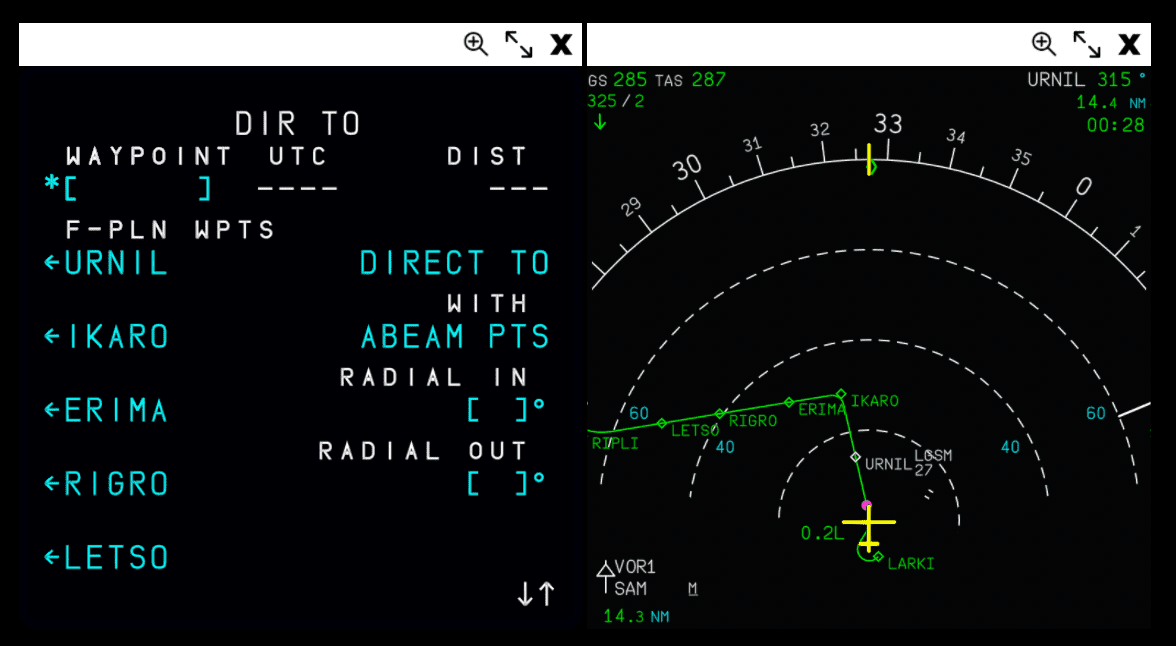 Before selecting a waypoint, you can visually see your en route waypoints on the ND matching those displayed on the DIR TO page in the side by side example below:
