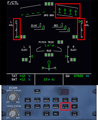 Using the ECAM control panel, press the F/CTL button to switch the lower ECAM to the flight controls. Ensure all flight controls are displayed in green.