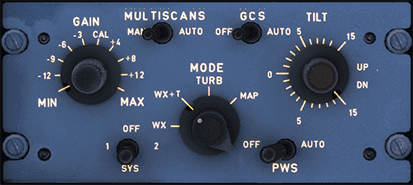 The current implementation of the weather radar in MSFS will show precipitation along the route. Additional functions are unavailable at this time. However, we should set the Radar to Sys 1 if required for departure.