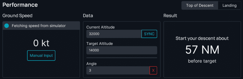 - Calculate the required distance needed to descend to that waypoint with a standard descent angle of 3°. We can use the FlyByWire flyPad in the cockpit or a simple rule of thumb calculation (details below).