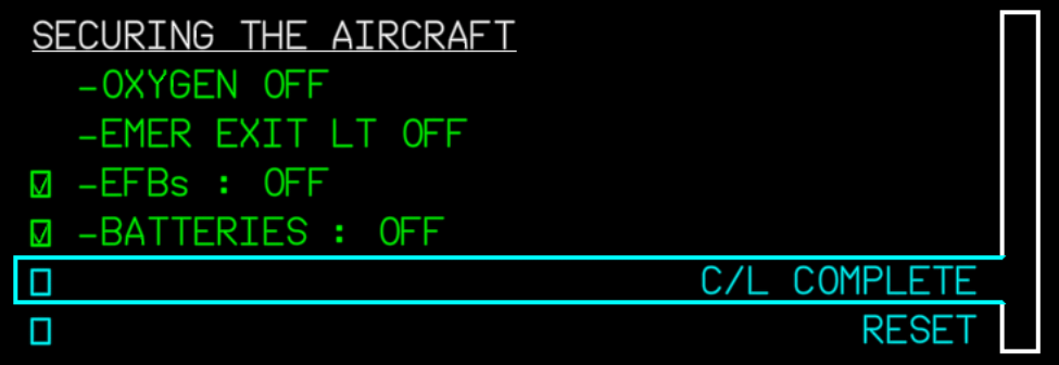 In the event that there is no other crew that will use this aircraft for a flight immediately following ours, we are going to secure the aircraft. Doing this will put the aircraft into a Cold and Dark state, meaning whoever flies the aircraft next will have to do a complete power up. To do this, we will need to shut off all lighting, power and fuel pumps. We are essentially doing the opposite of what we did when we powered the plane up from a Cold and Dark state.