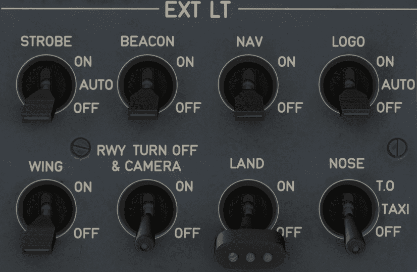 Turns on and off the three synchronized strobe lights, one on each wing tip and one below the tail cone.