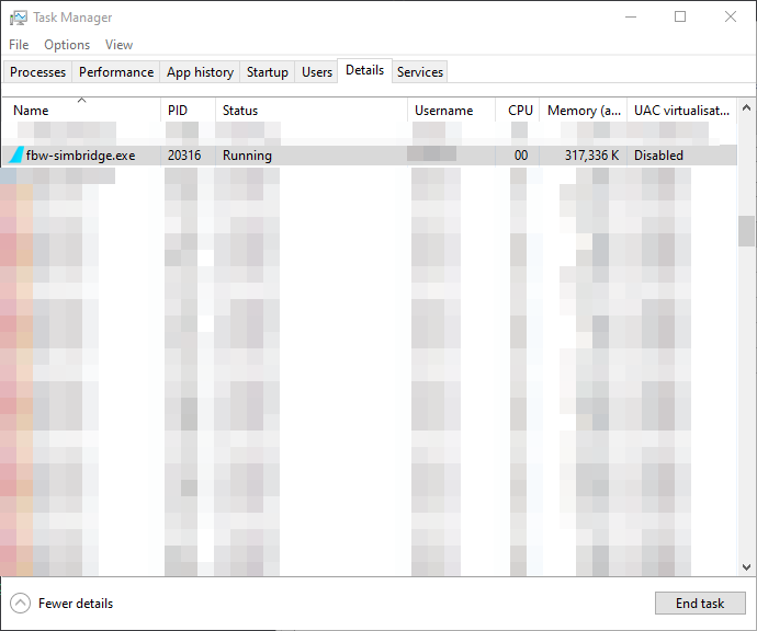 • If you encounter issues when closing SimBridge normally, you can kill the fbw-simbridge.exe process in Task Manager. task manager stop